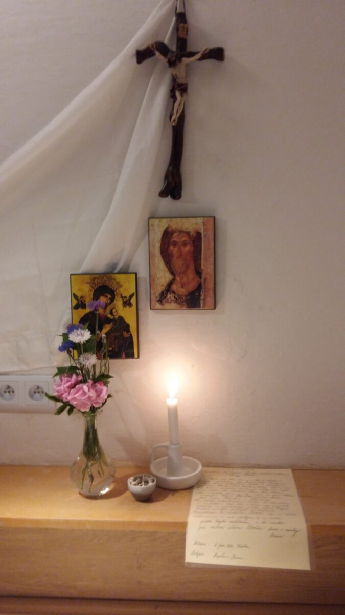 Вкінці я пережила урочисте закінчення посвяти вдома (додаю фото місця молитви у своїй кімнаті J). Завдяки вашій пропозиції та підготовці, яку ви зробили для нас, цілий місяць я могла переживати цілком особливий час, в якому змогла відчути ніжний супровід нашої Матері у простоті, в скритості та Її ніжності. При роздумах, які були запропоновані на кожен день, а особливо під час роздумів послань, для мене було викликом встати в правді перед собою. Мені допомогло, щоб все було наперед добре підготовлено.
