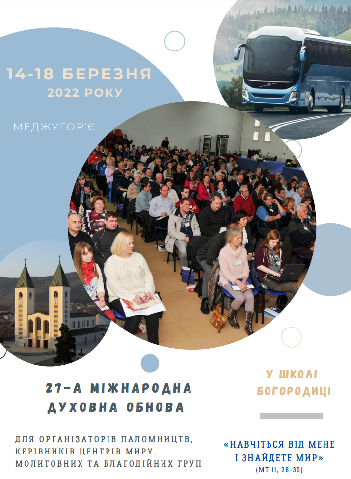 27-а міжнародна духовна обнова для організаторів паломництв, керівників центрів миру, молитовних і благодійних груп, пов’язаних із Меджуґор’єм, відбудеться в Меджуґор’ї з 14 по 18 березня 2022 року.